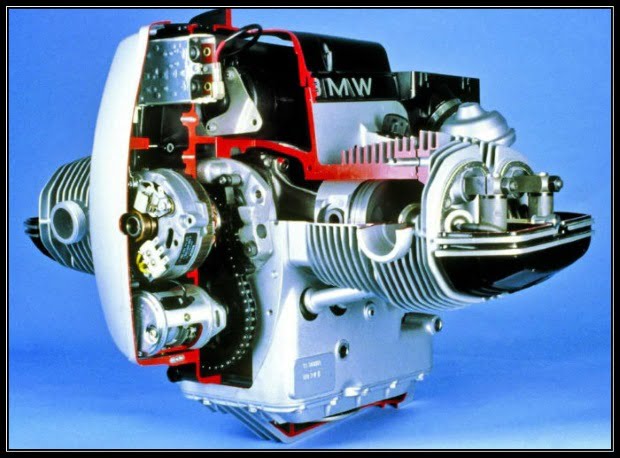 Este motor es seña de identidad de la marca alemana BMW. Permite una buena refrigeración, centro de gravedad relativamente bajo y también es ideal para usar cardán. Aunque parece que vibra mucho, es un motor muy equilibrado, pues los cilindros se compensan, pues “se abren” y “se cierran” al mirarlos de frente.