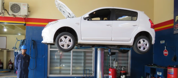 - Levantar el automóvil. Se pueden utilizar, gatos, torres o elevador. Si vas a utilizar un gato, se debe tener en cuenta el punto de apoyo del gato para no dañar alguna parte baja del auto. Si se va a utilizar una rampa se debe colocar el freno de mano y dos tacos que eviten que el automóvil se ruede o deslice. También se puede colocar en un foso o colocar dos ruedas sobre la acera.