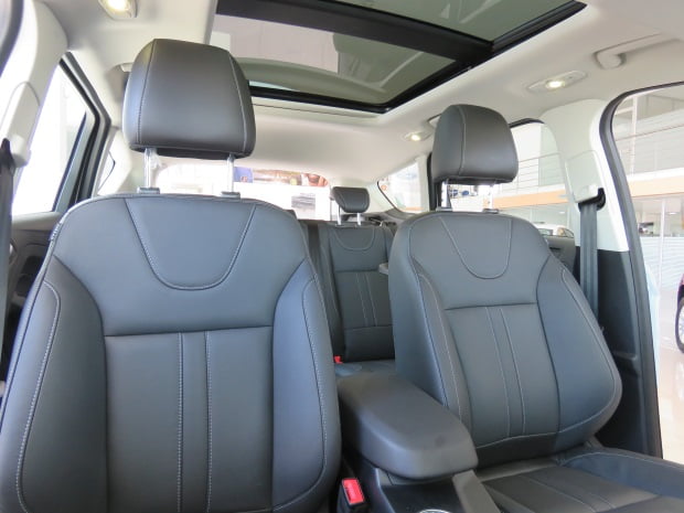 En el interior conserva la gran mayoría de detalles, tapicería en cuero, volante multifuncional y con regulación en altura y profundidad. El cluster conserva toda su estructura, se unen al tablero inferior del climatizador dos botones adicionales, el del control de parqueo activo y el botón para activar los sensores de reversa. Trae dos bandejas abatibles que salen de la silla del conductor y copiloto para los ocupantes de la zona trasera.