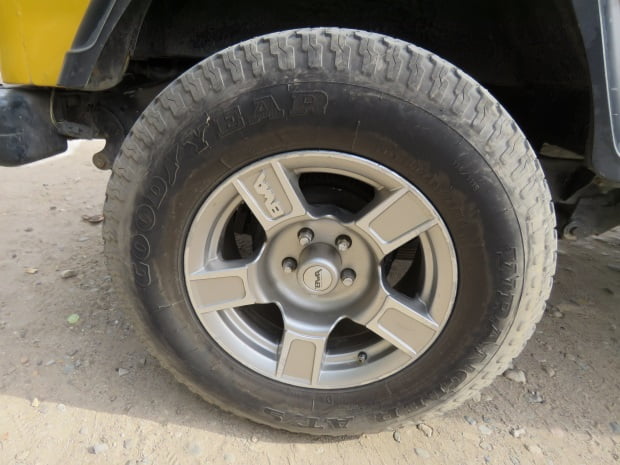 Extensiones plásticas laterales en el guardafangos y costado de color negro, así como el estribo lateral, las semipuertas sin ventana, versión carpada, espejos manuales de color negro. Rin 15 con llantas pantaneras. Ideal para terrenos agrestes y pantanosos.
