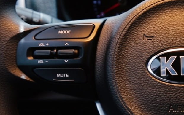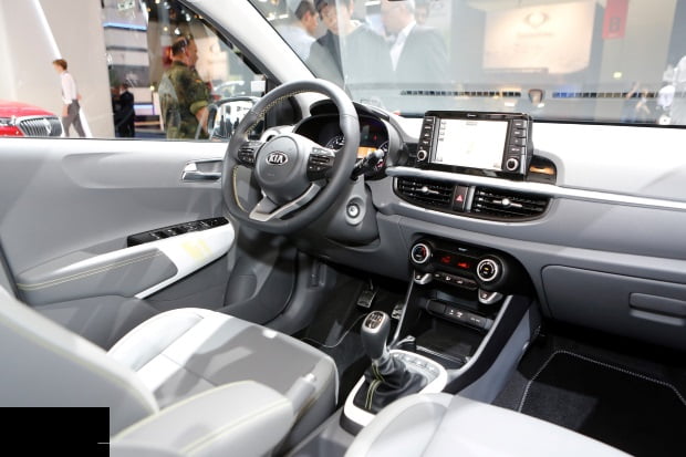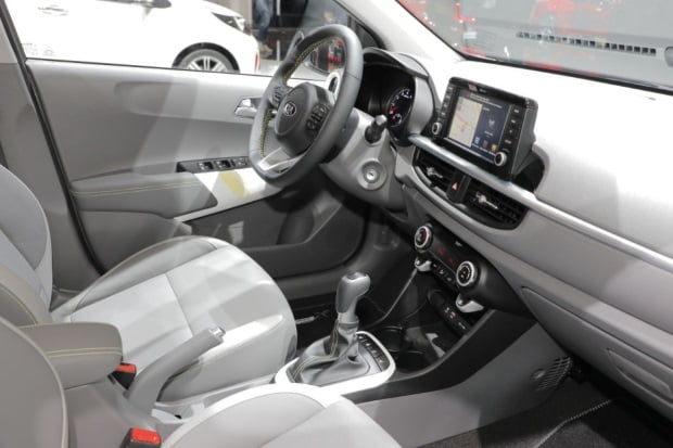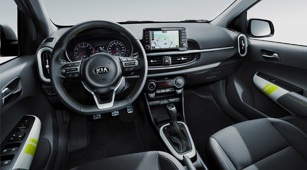 El timón del Picanto X-Line luce plano en la parte inferior y fue forrado en cuero, al igual que la palanca de cambios. El tapizado de los asientos y las molduras también marcan diferencia, así como el apoyabrazos central, que incluye espacio para almacenamiento de papeles o pequeños objetos. La pantalla central refleja también la cámara de reversa, ayudada aquí por sensores sonoros.