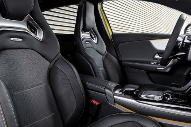 En el interior, el ambiente deportivo tiene su continuidad a través de nuevos materiales y de nuevos elementos de diseño. Recibe todos los elementos que pueden esperarse de una variante AMG: un volante deportivo con base achatada, el aro forrado en Alcantara y unos asientos de corte deportivo tapizados en piel heredados del A45 de anterior generación, con inserciones en aluminio que aseguran una sujeción acorde con las fuerzas laterales que es capaz de provocar el vehículo.