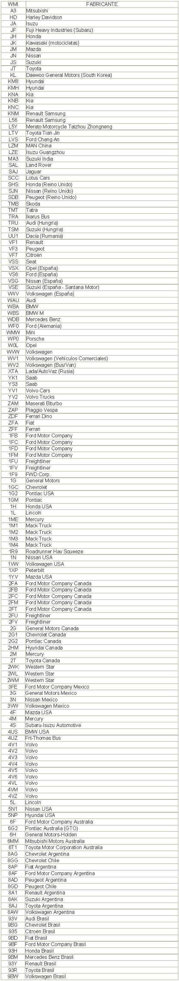 Mediante los dos primeros dígitos del Vin puedes saber donde fue fabricado, te dejamos algunos códigos para que te guíes: